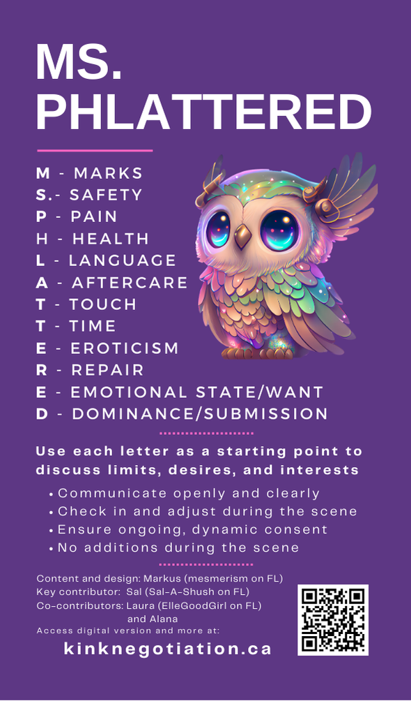 The Ms. Phlattered framework is designed to provide an easy to remember negotiation starting point for building healthy, consensual, and exciting kink experiences.
