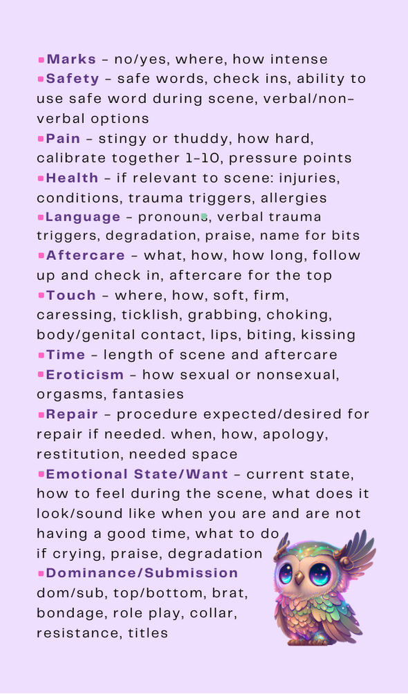 Use the mnemonic as an easy to remember structure for building healthy, consensual, and exciting kink experiences through clear and transparent communication and prioritizing the well-being of all parties involved.
